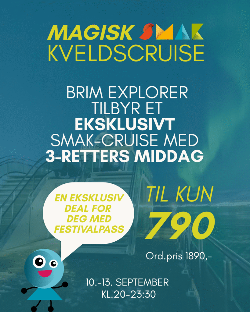 3 retters middag på et magisk kveldscruise med Brim Explorer i de arktiske fjordene rundt Tromsø til 790,- (ons-lør)